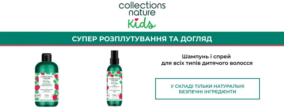 Засіб застоcування: Обережно вимийте дитяче волосся шампунем Super Detangling, а потім скористайтеся спреєм Collections Nature Kids для розчісування волосся.