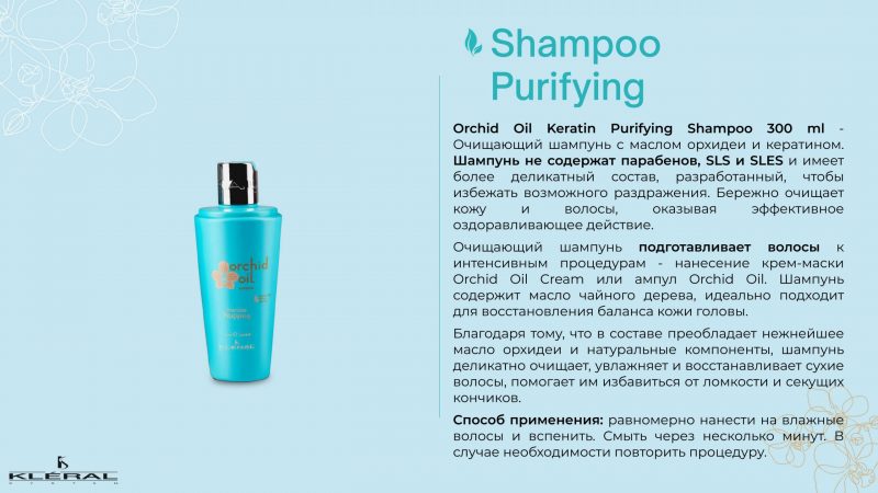 Способ применения: вымыть волосы очищающим шампунем Purifying с маслом орхидеи, нанести маску на волосы по всей длине. Смыть через 10-15 минут. - Orchid Oil Keratin Purifying Shampoo 300 ml – Очищающий шампунь с маслом орхидеи и кератином. Шампунь не содержат парабенов, SLS и SLES и имеет более деликатный состав, разработанный, чтобы избежать возможного раздражения. Бережно очищает кожу и волосы, оказывая эффективное оздоравливающее действие.